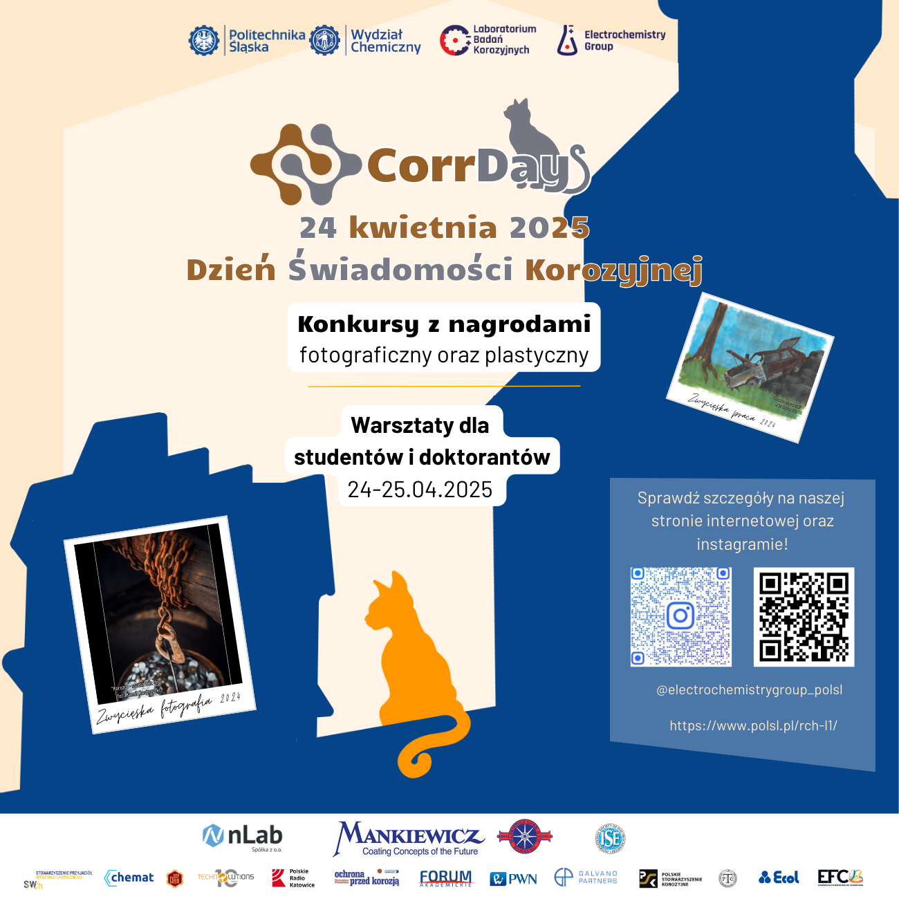 Wszystkich miłośników chemii zapraszamy do udziału w Dniach Świadomości Korozyjnej – CorrDays 2025 organizowanych na Wydziale Chemicznym Politechniki Śląskiej w Gliwicach! Zachęcamy do wzięcia udziału w naszych warsztatach i konkursach związanych z korozją.